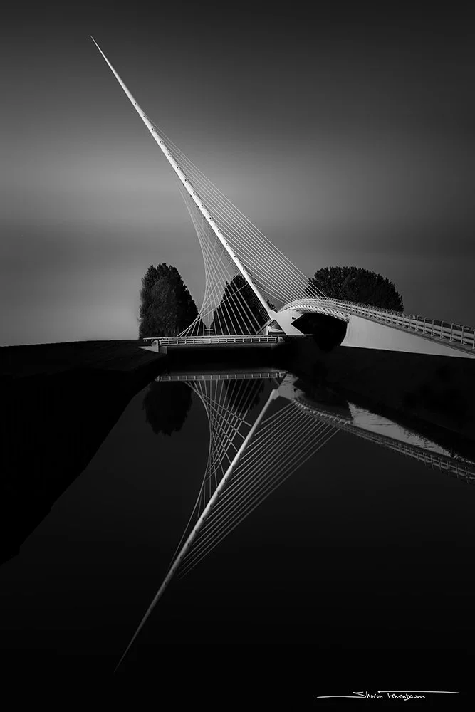 My intention with the images below was to celebrate the geometry of the Sundial Bridge in Redding, California. I wanted to accentuate the lines, curves and most importantly, the depth. The ‘story’ I wanted to tell was all about form and light. A simple conversion to black and white did not quite accomplish my task. I needed to take it further by adding an ‘umph’, a wow factor that would not only increase the contrast, but also transform the image from a flat, mediocre, two-dimensional image to one in which the viewer can feel immersed in the geometry of the bridge.