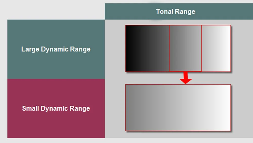 The image below demonstrates the concept of a Large and Small Tonal Range. A large dynamic range includes all the tones from pure black to pure white, whereas a small dynamic range does not include the extreme tones of pure black and pure white. It only includes a portion of the full spectrum tone.